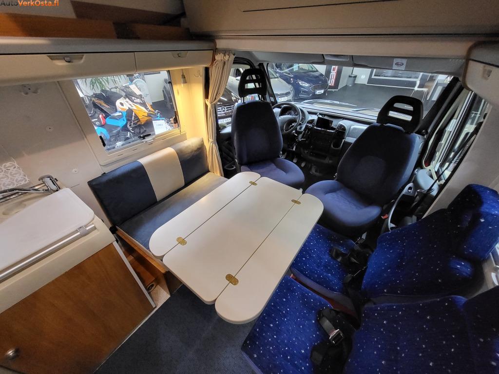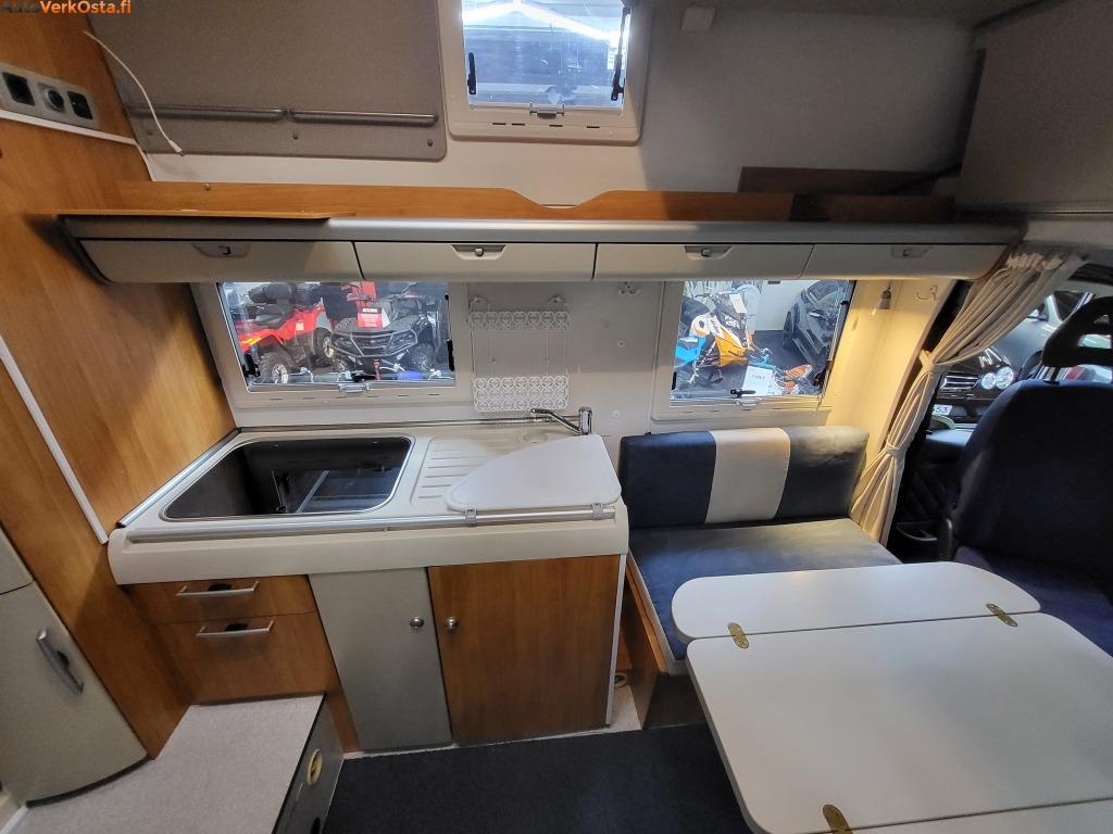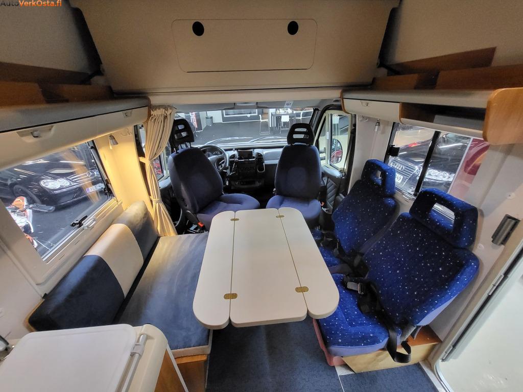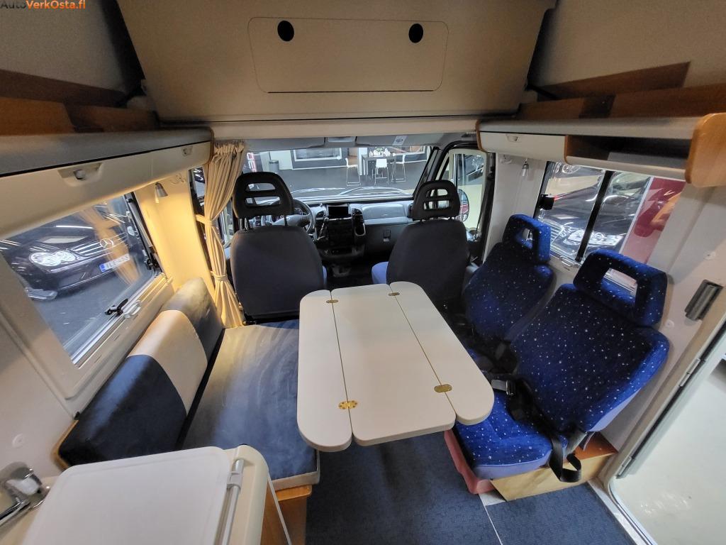 Tämä käytännöllinen ja fiksulla pohjaratkaisulla oleva Hymer tarjoaa istumapaikat jopa 6 henkilölle. Leveä yläpeti sekä pöytäryhmästä saa tehtyä pedin.