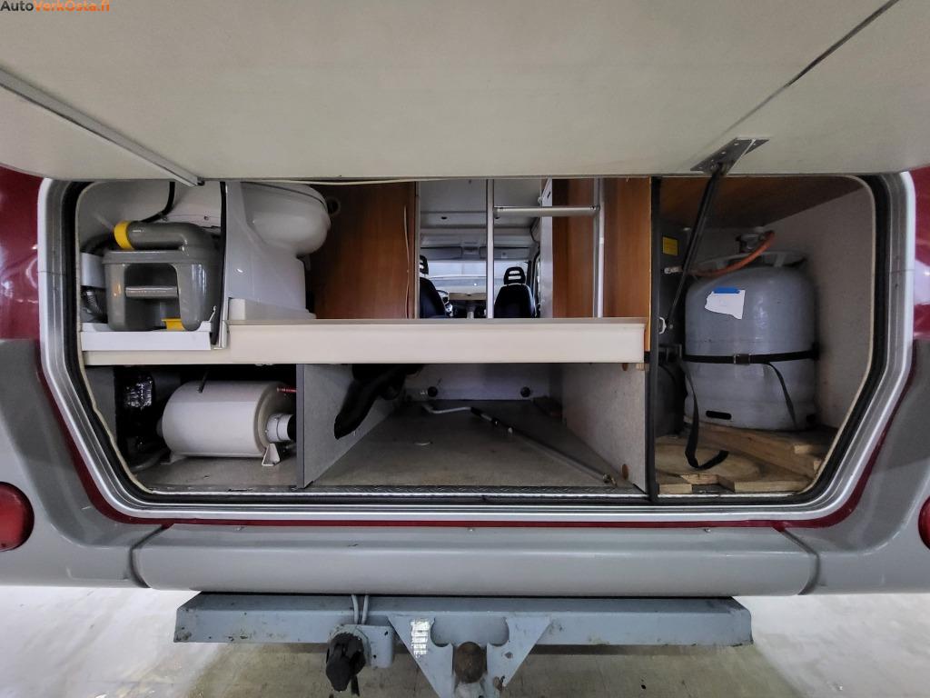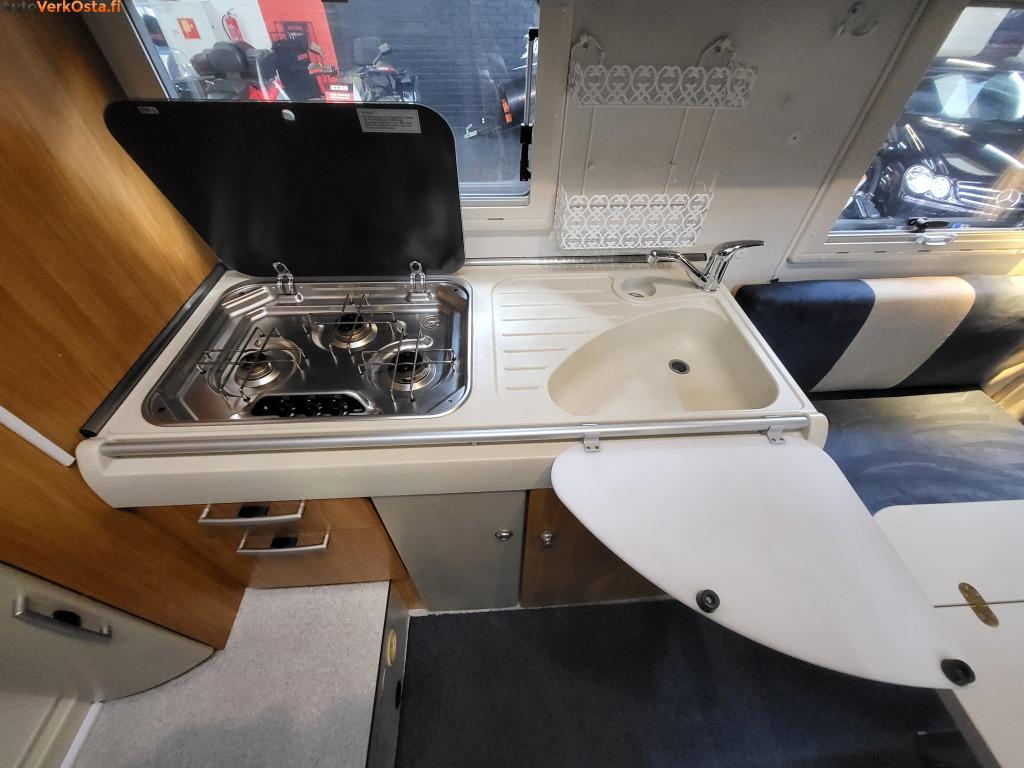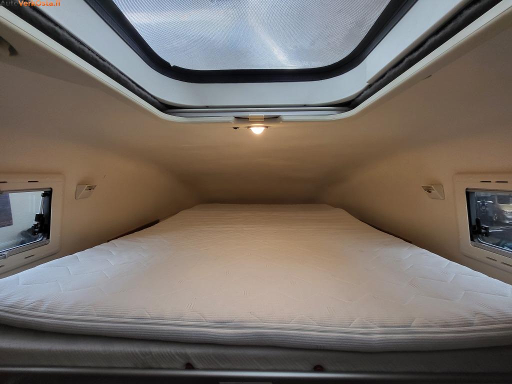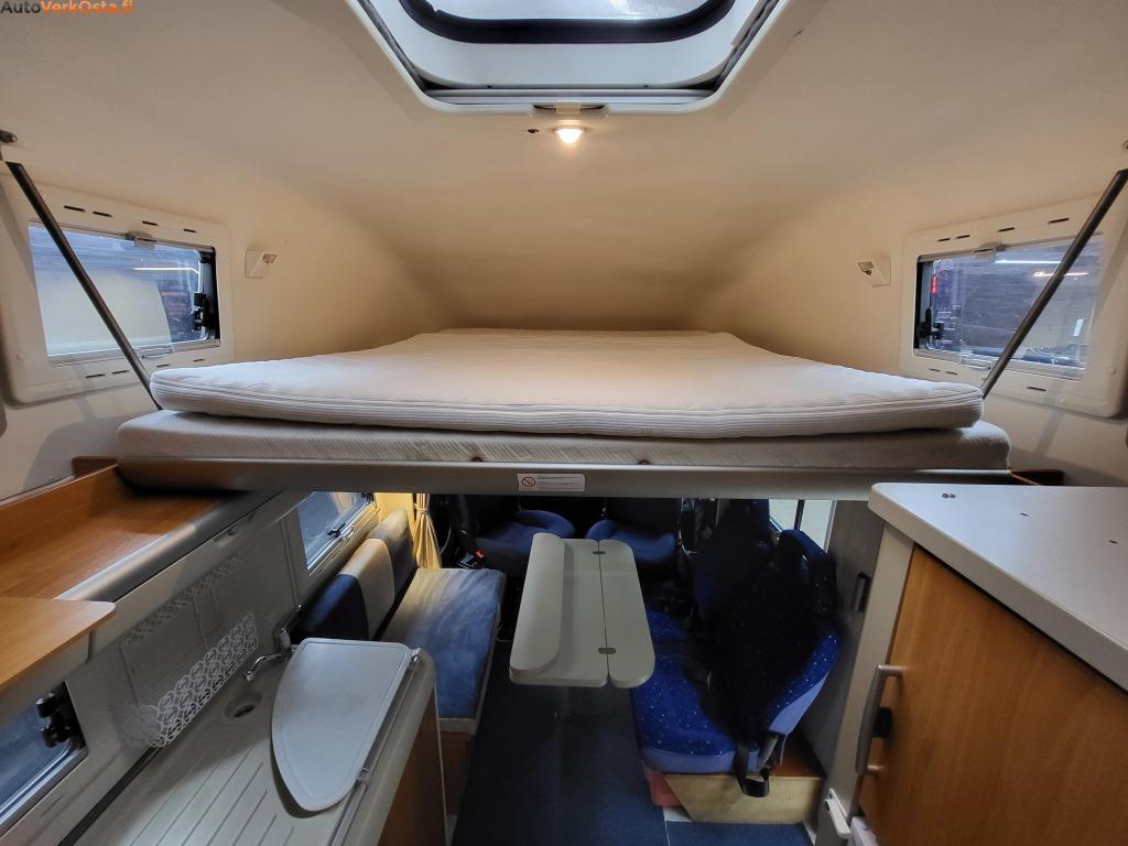 Tämä käytännöllinen ja fiksulla pohjaratkaisulla oleva Hymer tarjoaa istumapaikat jopa 6 henkilölle. Leveä yläpeti sekä pöytäryhmästä saa tehtyä pedin.